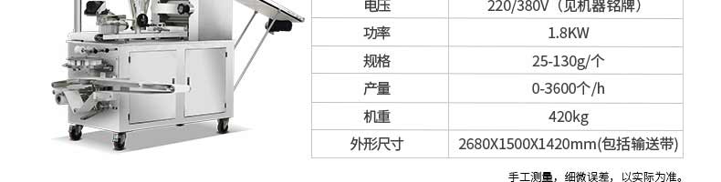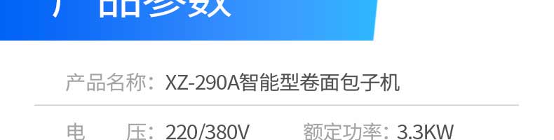 名稱XZ-290A智能卷式包子機(jī) 電源220/380v 功率3.3kw 產(chǎn)量0-36000個(gè)/h 尺寸2680*1500*1420mm 重量420kg 規(guī)格 其他
