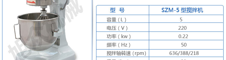 SZM-5型攪拌機,可用于攪拌奶油、蛋糕液、餡料及和制面團等操作。打蛋攪拌機等作攪拌食料、揉和面團之用,是生產優(yōu)質糕點的理想設備,適用于酒店、飯店、學校部門、面包屋以及食品廠家。