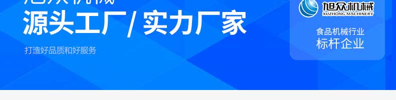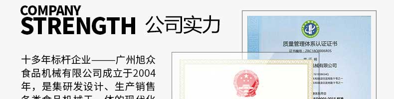 廣州旭眾食品機(jī)械有限公司是一家集科研開發(fā),生產(chǎn)設(shè)計,營銷服務(wù)為一體的現(xiàn)代化生產(chǎn)企業(yè)?,F(xiàn)代化生產(chǎn)車間,精湛制造技術(shù),所產(chǎn)機(jī)械歷經(jīng)市場重重考驗,不斷贏得海內(nèi)外客戶的贊譽(yù)。