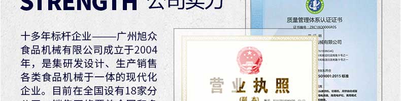 廣州旭眾食品機(jī)械有限公司是一家集科研開發(fā),生產(chǎn)設(shè)計(jì),營銷服務(wù)為一體的現(xiàn)代化生產(chǎn)企業(yè)。現(xiàn)代化生產(chǎn)車間,精湛制造技術(shù),所產(chǎn)機(jī)械歷經(jīng)市場重重考驗(yàn),不斷贏得海內(nèi)外客戶的贊譽(yù)。