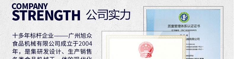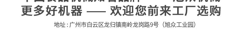 廣州旭眾食品機械有限公司是一家集科研開發(fā),生產(chǎn)設計,營銷服務為一體的現(xiàn)代化生產(chǎn)企業(yè)。現(xiàn)代化生產(chǎn)車間,精湛制造技術(shù),所產(chǎn)機械歷經(jīng)市場重重考驗,不斷贏得海內(nèi)外客戶的贊譽。